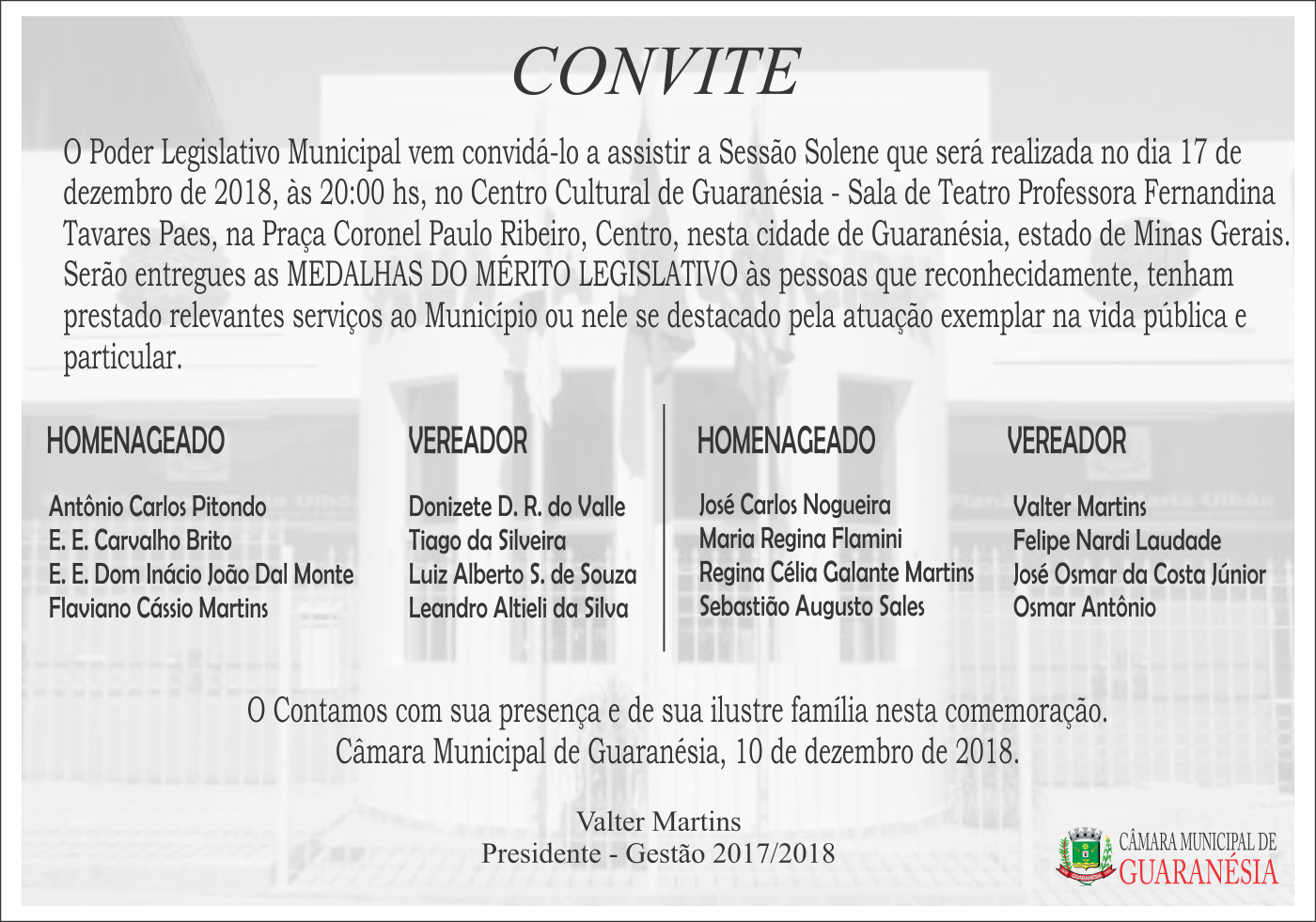 Sessão Solene de Entrega de Medalhas do Mérito Legislativo Sessão Solene que será realizada no dia 17 de Dezembro de 2018, às 20:00 horas, no Centro Cultural de Guaranésia. 2018-12-10 Camaraguara